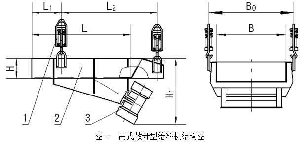 其結(jié)構(gòu)如圖一、二所示:主要有:1、減振器;2、槽體;3、振動(dòng)電機(jī)三部分組成,給料機(jī)采用兩臺同一規(guī)格的振動(dòng)電機(jī)為激振源。